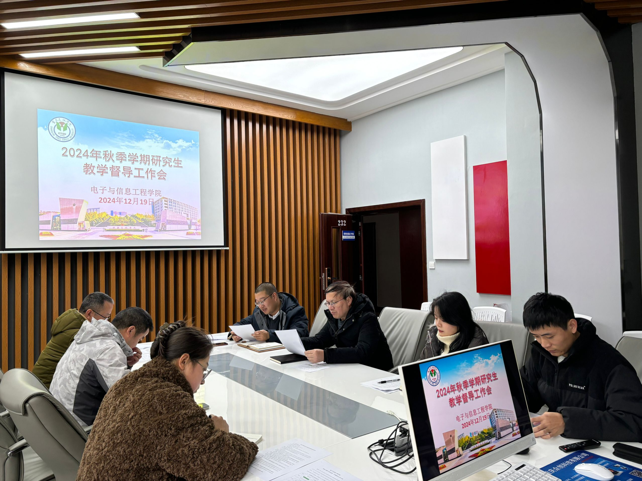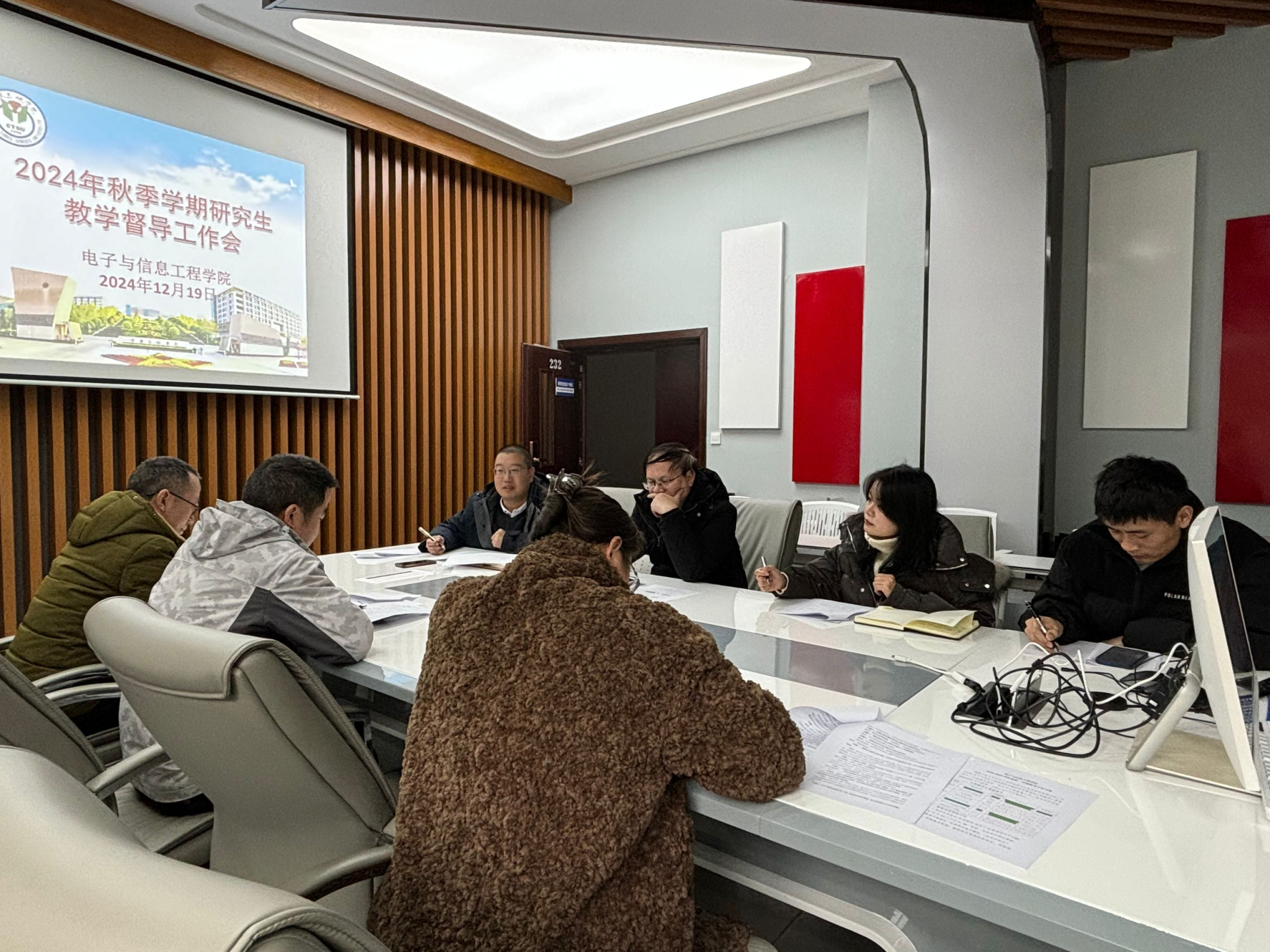 本次会议主要梳理了电信学院本学期的督导工作、前期研究生座谈会反馈较多的问题如何解决或改进、下学期学位论文督查工作具体安排等。具体内容为如下三个方面:一是对本学期督导听课、与学生座谈、实践环节抽查情况做了梳理;二是对11月14日督导团分别与研一研二同学集体座谈会中,同学反馈较多的问题,如进行深入考量,如工位椅子损坏、上课地点与实验室距离较远、可选课程较少、助教学时计算需进一步细化、学生请假流程需进一步细化等问题,进行深入分析,讨论解决方案,并落实具体改进人员;三是针对下学期要进行的学位论文督查问题,讨论了具体执行时间与初步方案。