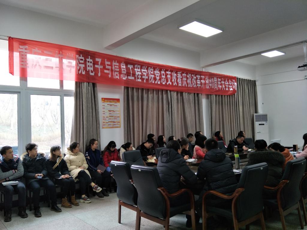 12月18日,我院党总支在慎思楼1栋232党员活动室收看庆祝改革开放40周年现场直播,一睹40年的变迁,汲取奋进的力量。太阳成集团tyc122ccvip党总支书记、院长聂祥飞,党总支常务副书记周科,副院长王安蓉,党总支副书记牟奇建,副院长谢辉以及全体党员老师、党员学生观看了本次直播。