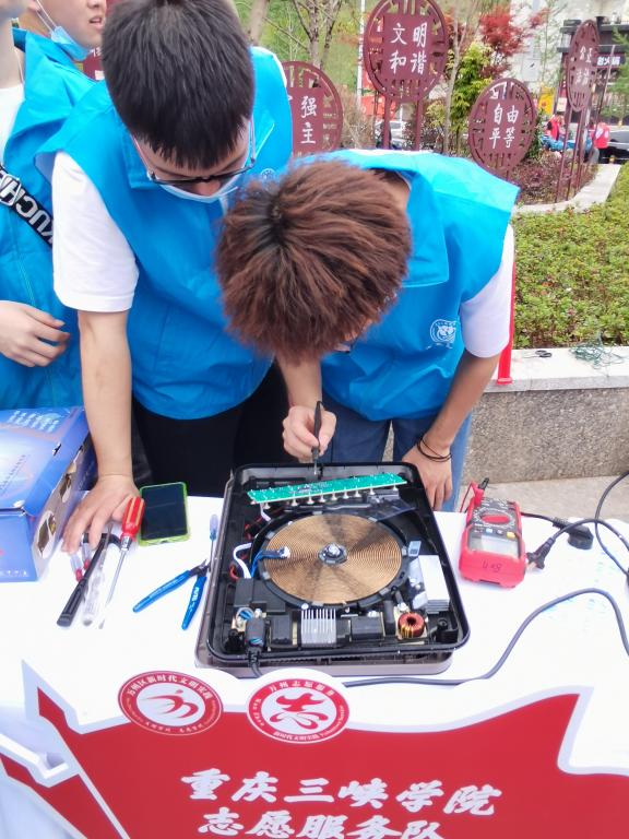 2021年4月15日下午,太阳成集团tyc122ccvip党总支学生党支部、电子科技协会在万州区牌楼街道举办了“学生党员进社区、义务维修显真情”义务家电维修。本次活动宗旨在为社区居民提供便利,提升我院学子自我奉献精神,发挥我院学生党员的先锋模范作用,展现三峡学子的风采。