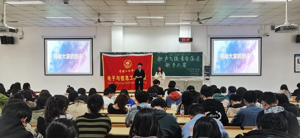主持人介绍活动背景,宣布比赛正式开始。参赛选手们争奇斗艳,使出浑身解数,用他们各具特色的声线展现他们的实力、用他们美妙的歌声感染着观众的心灵。听歌识曲互动环节,同学们热情高涨、争先恐后,积极踊跃举手抢答,热闹非凡。助唱嘉宾的一首《江南》为比赛画上了一个完美的句号。整场比赛精彩纷呈,让人流连忘返。选手们在舞台上尽情展示,创造了一幅幅靓丽的风景画,他们用自己动听的歌声和不俗的舞台表演,诠释着青春飞扬的主题,展现了电信学子的青春靓丽、自信活泼。